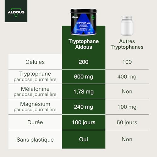 💊 200 GÉLULES DE TRIPTOPHANE NATUREL À 10 CENTIMES L’UNITÉ – Ce complément garantit 200 capsules végétales de 830 mg chacune pour un emballage unique sans plastique. La dose journalière est de 2 Gélules. Elle contient 600 mg de Tryptophane, 1,78 mg de Mélatonine, 240 mg de Magnésium, 200 mg de Spiruline avec des Vitamines B6, B5 et B3.