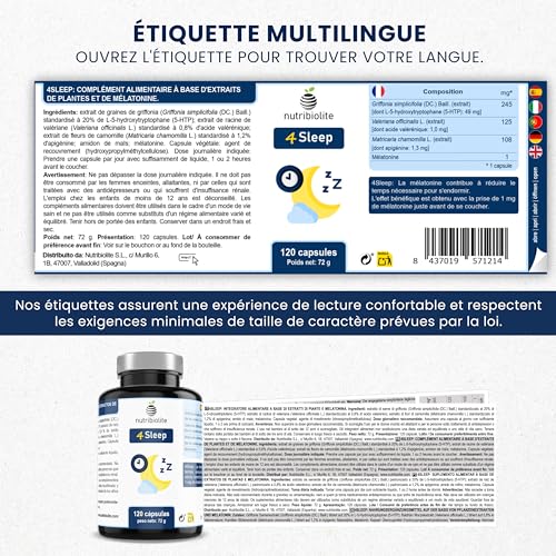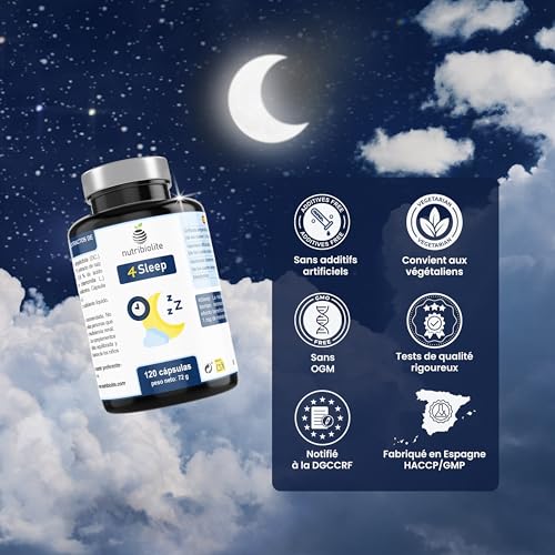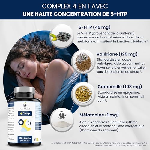 5-HTP et Mélatonine, 120 Capsules Hautement Dosées pour Bien Dormir (1 capsule par jour) avec Valériane et Camomille. Végétalien, Sans Additifs – 4Sleep Nutribiolite