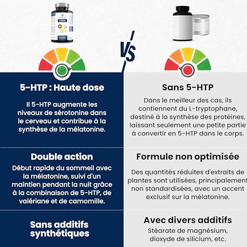 ➤ NATUREL ET EFFICACE : 4Sleep associe le 5-HTP (de GRIFFONIA), précurseur de la sérotonine à cause l’organisme, bien plus efficace que le tryptophane, avec la mélatonine. La sérotonine se convertit en mélatonine pendant la nuit. La MÉLATONINE contribue à restreindre le temps nécessaire à cause s’abrutir. La VALÉRIANE et la CAMOMILLE sont des plantes historiquement utilisées à peu près relaxants naturels, sources naturelles d’bourru valérénique et d’apigénine, des substances aux propriétés apaisantes.