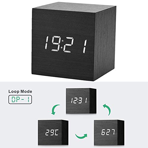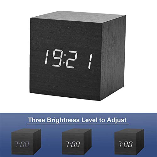 Specification: 6x6x6cm en bois électronique numérique horloge de bureau température LED lumières affichage commande vocale trois alarmes mode de commande vocale et mode toujours lumineux(Bois noir + lumière blanche)