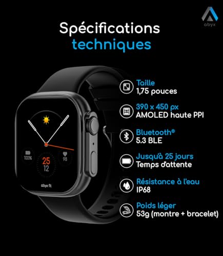Specification: Abyx Fit Touch 5 – Montre connectée avec écran Tactile AMOLED 1,75 Pouce, Fonctions téléphone, Suivi de la santé (Pression artérielle, fréquence Cardiaque, Sommeil, SpO2) et Sport, étanche IP68