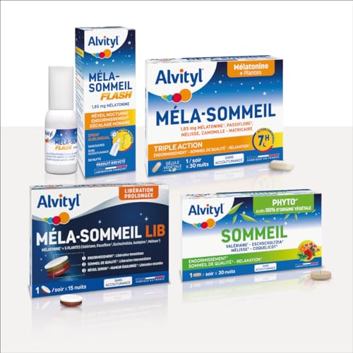 Specification: Alvityl Méla-sommeil – Mélatonine + 3 plantes + vitamine B6 – Triple action sur le sommeil et la relaxation- 1,85mg Mélatonine – Action Chrononuit 7h – 45 gélules