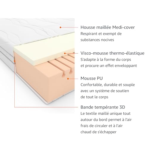 La housse amovible en polycoton est lavable en machine jusqu’à 60 °C à cause un blanchissage rapide, ouvert et hygiénique. La bande climatique en 3D assure une meilleure circulation de l’air, aide à évacuer l’humidité et maintient un environnement de sommeil optimal.