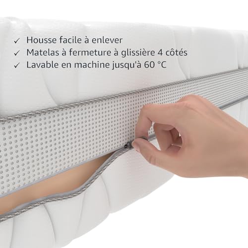 La housse amovible en polycoton est lavable en machine jusqu’à 60 °C pour un nettoyage rapide, facile et hygiénique. La bande climatique en 3D assure une meilleure circulation de l’air, aide à évacuer l’humidité et maintient un environnement de sommeil optimal.