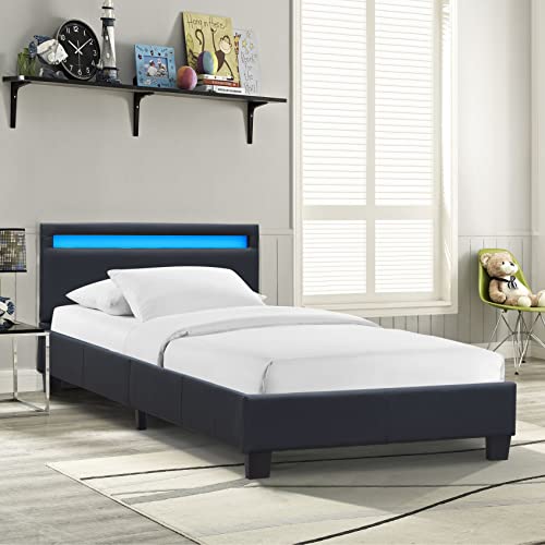 Angel – Solide et Confortable Lit 120×190 avec Sommier + Tête de Lit avec Eclairage LED Couleur Noir + Pieds en 10 cm pour Matelas en – 13 Lattes – revetement PVC Simili Facile d’entretien – Mont