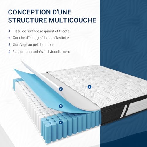 Confortable et Respirant : ce matelas de 20 cm est conçu avec des mousses multicouches et un tissu tricoté doux pour la peau pour un toucher doux et une sensation luxueuse, créant ainsi une surface confortable et respirante pour un sommeil réparateur La mousse gel régule naturellement la température du matelas et assure une bonne circulation de l’air pour rester au frais toute la nuit
