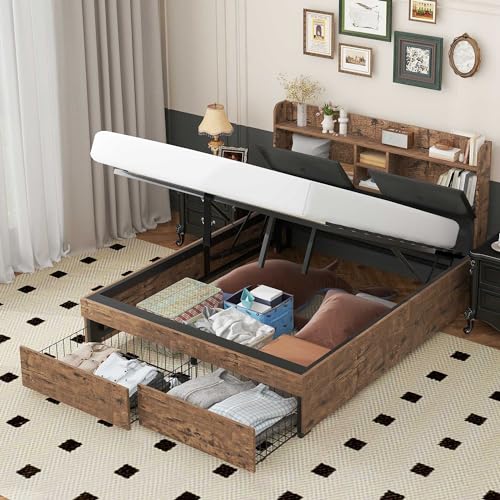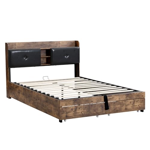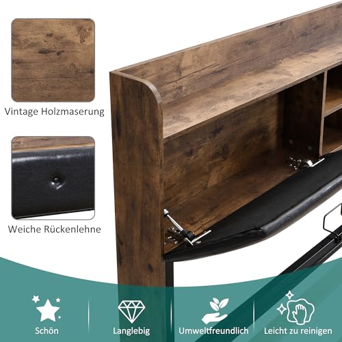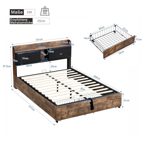 Specification: Azkoeesy Lit double avec coffre de lit, 2 tiroirs en métal, tête de lit de rangement, tête de lit rembourrée en cuir PVC, cadre de lit en métal, grain de bois vintage (140 x 200 cm)