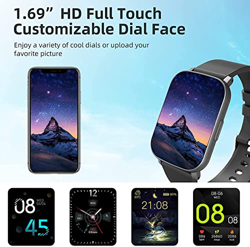 【Smart Watch for Men and Women】The smart watch features a 1.69-inch color full touch HD screen, sensitive touch, unique design, 33g lightweight, 20mm silicone replaceable strap for comfortable wearing. Great gift for holiday or everyday occasions.