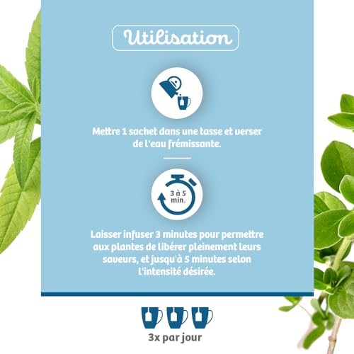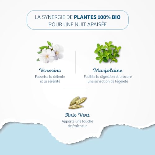 SYNERGIE DE PLANTES APAISANTES : Notre infusion BioNutrisanté Sommeil associe la verveine, la marjolaine et l’anis vert. La verveine facilite la relaxation en aidant à diminuer les tensions et l’agitation. La marjolaine favorise la digestion et procure une sensation de légèreté avant la nuit, favorable à l’endormissement. L’anis vert complète la formule en y apportant une touche de fraîcheur.