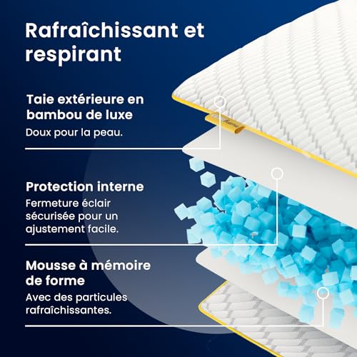 Housse douce au toucher & Gel Rafraîchissant haute technologie : La taie d’oreiller en bambou est faite d’un tissu jacquard respirant qui permet à l’air chaud de se disperser et de s’aérer grace au gel réfrigérant infusé, ce qui en fait l’oreiller anti-transpirant idéal.