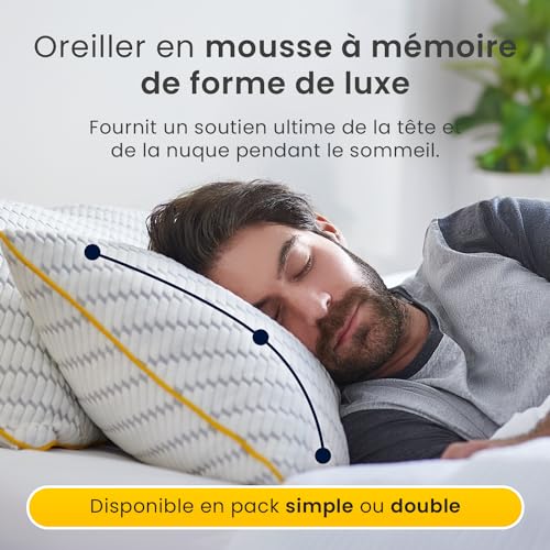 Pour un sommeil profond toute la nuit : Ces oreillers de qualité supérieure sont remplis d’une mousse à mémoire de forme en flocons ultra-douce et confortable, enrichie de particules rafraîchissantes et d’un mélange ultra-doux de fibres 3D. Ainsi, l’oreiller épouse et soutient votre tête et votre cou pour une nuit de sommeil profond et réparateur. Dimensions : 71 x 45 cm