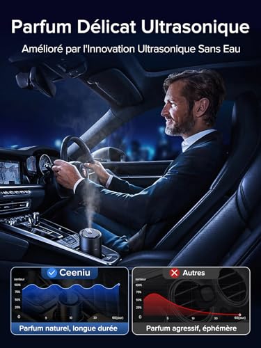 Specification: Desodorisant Voiture Ceeniu, F26 Diffuseur de Voiture, Atomiseur à Ultrasons, Concentration Réglable, Marche/Arrêt Automatique, Parfum Naturel Français 45 ML, Durée 6 Mois, Parfum Voiture de Cologne