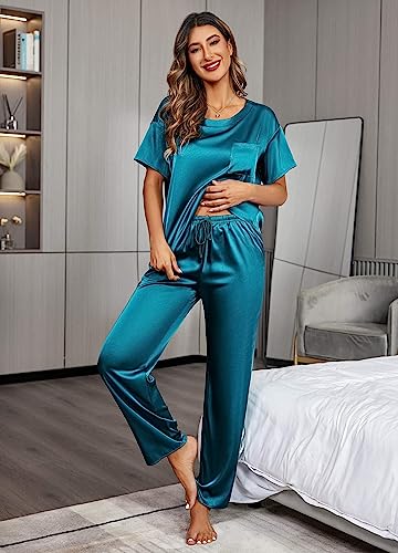 Ekouaer Pyjama Femme Ete Vetement en Satin Pantalon Femme Légère Ensemble Pyjama Manche Courte, S-XXL