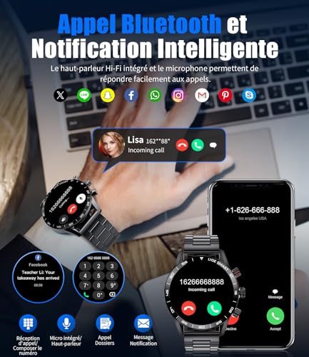 【Appels et Notifications Bluetooth】: Restez connecté avec la possibilité de passer, répondre et refuser des appels directement depuis votre poignet en utilisant cette montre de fitness. Une fois jumelée à votre smartphone, elle peut synchroniser jusqu’à 70 contacts. De plus, cette montre connectée pour hommes peut recevoir des notifications des applications populaires telles que Facebook, Instagram, YouTube, WhatsApp et Twitter.