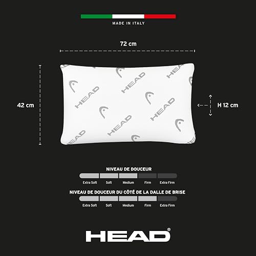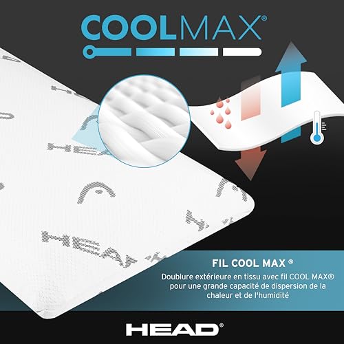AVEC TAIE D’OREILLER ZIP LAVABLE ET TISSUS CERTIFIÉS SANITIZED, HYPOALLERGÉNIQUE ET ANTI-ACARIENS : Il offre un repos plus sain, en particulier dans ceux qui souffrent d’allergies, fabriqué avec des matériaux antibactériens, hypoallergéniques et anti-acariens. La taie d’oreiller est personnalisée avec le logo HEAD et est déhoussable, avec une taie d’oreiller pratique lavable à 30°, à repasser à basse température. La plaque peut être essuyée avec un chiffon humide, loin de la lumière directe