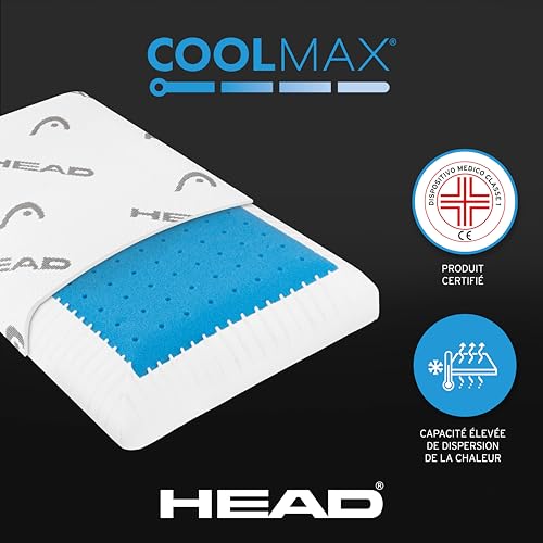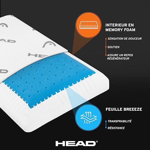 HEAD Active Rest – Oreiller Ergonomique Cervical Doux avec Plaque Breeze Très Respirant, Oreiller Memoire Forme Technologie Coolmax®, Coussin Memoire Forme avec Taie Lavable Antiacarien 42×72, Blanc
