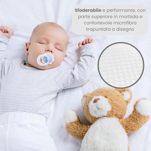 👶🏻 DÉVELOPPEMENT PSYCHO-PHYSIQUE DU NOURRISSON : Le matelas joue un rôle très important dans le développement psycho-physique correct du nourrisson dès les premiers mois de vie. Un repos approprié dépend de produits fabriqués avec des matériaux de qualité et performants. Ce matelas crée un environnement de sommeil de qualité avec un niveau de confort excellent et optimal grâce à la housse douce et matelassée.