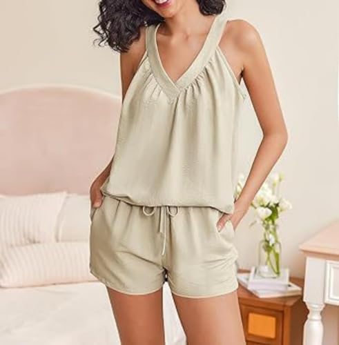 Specification: LinZong 2 Piece Lounge Sets for Women,Soft Pajama V Neck Sleeveless Tank Top and Shorts,Summer Sleepwear Set with Pockets (Beige,M)
