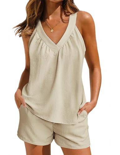 LinZong 2 Piece Lounge Sets for Women,Soft Pajama V Neck Sleeveless Tank Top and Shorts,Summer Sleepwear Set with Pockets (Beige,M)
