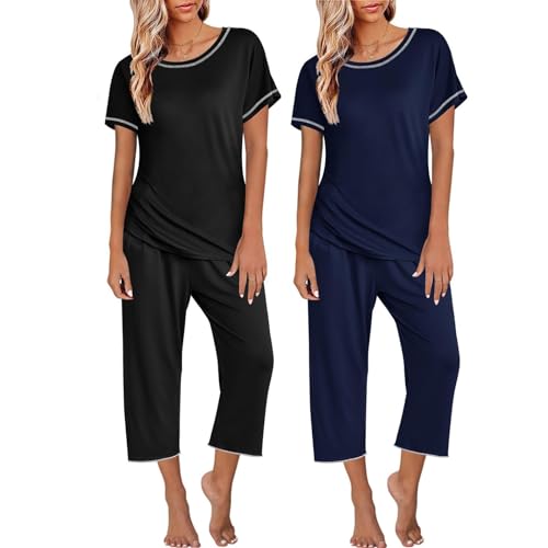 Lot De 2 Pyjamas Femmes Sleepwear T-Shirt Manche Courte + Pantalon 3/4 Ensemble Pyjama Femme Sexy Chic Coupe Ample Fluide Lingerie Idéal pour Printemps-Été Pyjama 2 Pièces