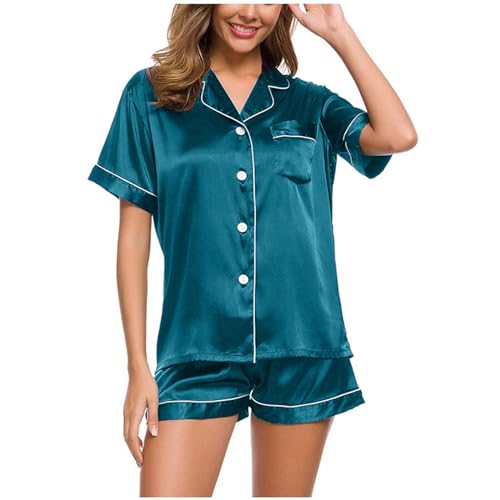 Specification: Masrin Ensemble pyjama pour femme – En satin – 2 pièces – Couleur unie – Chemisier à manches courtes + pantalon de pyjama avec ourlet à volants – Soyeux et doux – Pyjama familial – Couple – Chemise de