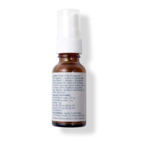 Hydrolat de fleur d’oranger amer (Citrus aurantium L.) ; extrait fluide de feuille de mélisse (Melissa officinalis L.) ; chlorhydrate de pyridoxine (vitamine B6) ; chlorhydrate de thiamine (vitamine B1) ; mélatonine ; épaississant : gomme xanthane ; acidifiant : acide citrique ; arôme ; conservateurs : sorbate de potassium, benzoate de sodium ; édulcorant : glycosides de stéviol. Dosage pour 2 pulvérisations / jour : Hydrolat de fleur d’oranger : 209 mg Extrait de feuille de mélisse