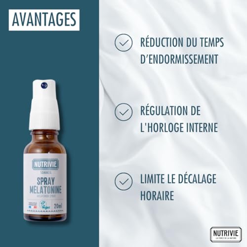 Passez une bonne nuit de sommeil grâce au Spray Mélatonine NUTRIVIE. ;La mélatonine aide à rogner le temps d’endormissement et intervient pour les mécanismes de régulation de l’horloge interne à l’organisme et donc pour la régulation des phases de veille et de sommeil. ;Très efficace, ce complément alimentaire est réservé aux adultes ayant des troubles du sommeil et aux voyageurs qui peinent à retrouver un endormissement accostable et régulier. Son action renforcée par la présence d’hydrolat de fleur d’oranger et des vitamines B6 et B1 optimisent cette action et contribuent à rogner la abaissement, à mieux assimiler le magnésium et permettent un meilleur fonctionnement normal du système nerveux.Au bon goût d’eau de fleur d’oranger.