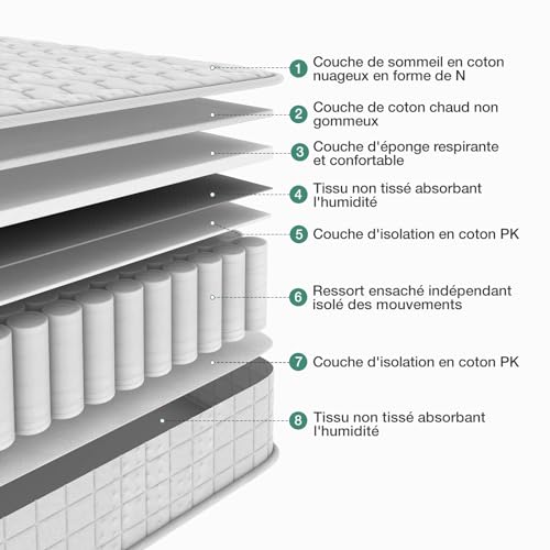 🍀PARFAIT SOUTIEN🍀 Le matelas est conçu avec des ressorts ensachés pour soutenir fermement votre corps. Il est rempli de mousse D2030 pour un confort accru et surmonté d’une couche matelassée de tissu polyester de haute qualité pour un confort accru de la peau. Nous le recommandons à ceux qui préfèrent un matelas mi-ferme.