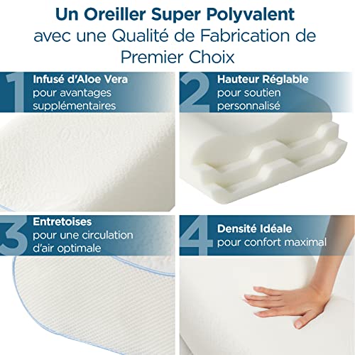 Specification: ORTHOVERSE Oreiller Memoire Forme pour Dormir avec Hauteur Réglable et Infusé à l’Aloe Vera – Oreiller Orthopédique à Mémoire de Forme – Extra Respirant, Antibactérien, Hypoallergénique