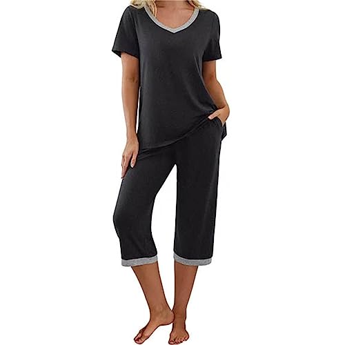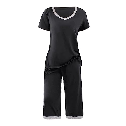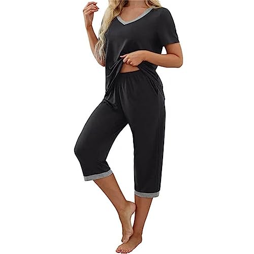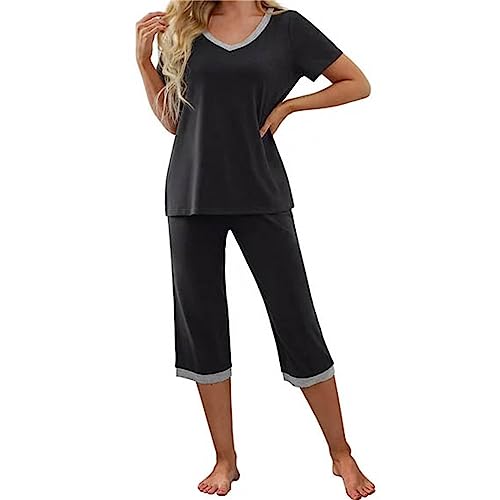 Pyjama Femme Ete Coton Ensemble De Pantalon Élégant pour Femme Pyjama Chemise Manche Courte Et Pantalon 3/4 Léger Et Respirant pour Femme Sleepwear Printemps Été Décontractée Pyjama 2 Pièces