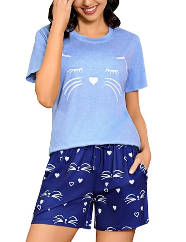 Sykooria Pyjama Coton Femme Court Femmes Ensembles Pyjama été Femme Short Pyjamas Vêtements de Nuit T-Shirt Manche Courte et Short Doux d’été S-XXL