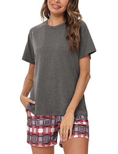 Uniexcosm Pyjama Femme Coton Court Ensembles de Femme Ete Carreaux Col Rond Manches Courtes Pyjama pour Femme Short avec Poches Latérales